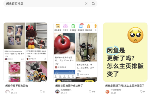 目前闲鱼社区文化不仅有讨论组入口,也在首页设置了类似小红书推荐界面的双列信息流。闲鱼CEO丁健把闲鱼首页看作搜索和发布功能之外的功能,认为首页推荐可以作为土壤,给兴趣玩家提供一个更偏社区化的场域。在科技媒体晚点的访谈里,丁健提到,“闲鱼的人群聚集在相对专业的兴趣领域,大家是同一群人,可以高质量地讨论.......”